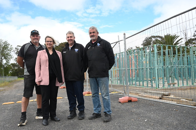 Builder Paul Kuchel, Minister for Primary Industries and Regional Development Clare Scriven, Jerome England and Apollo Football Club president Andrew Donehue in front of the developments for the club's new women's change rooms, toilets and showers. (Tyler Redway: 518902)